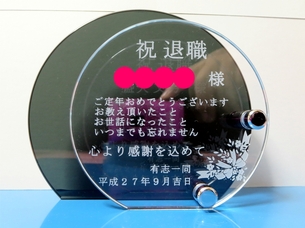 退職記念品として、ご依頼がありました。ブラックガラスとクリアガラスどちらも彫刻ができます。