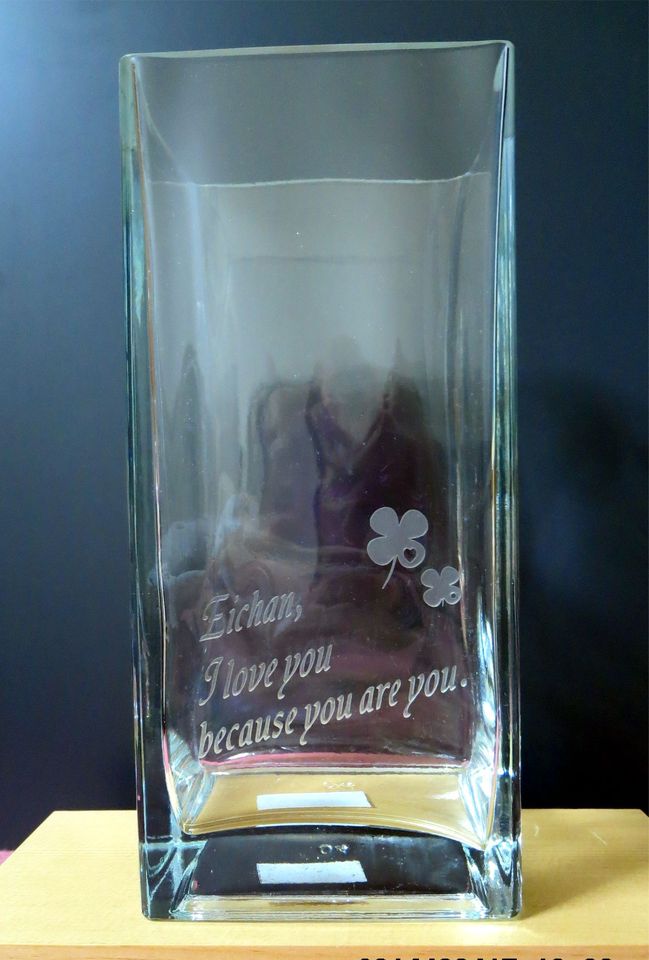 《持込み》資格取得のお祝いガラスの花瓶にプレゼントする相手の方の好きな言葉を彫刻しました。